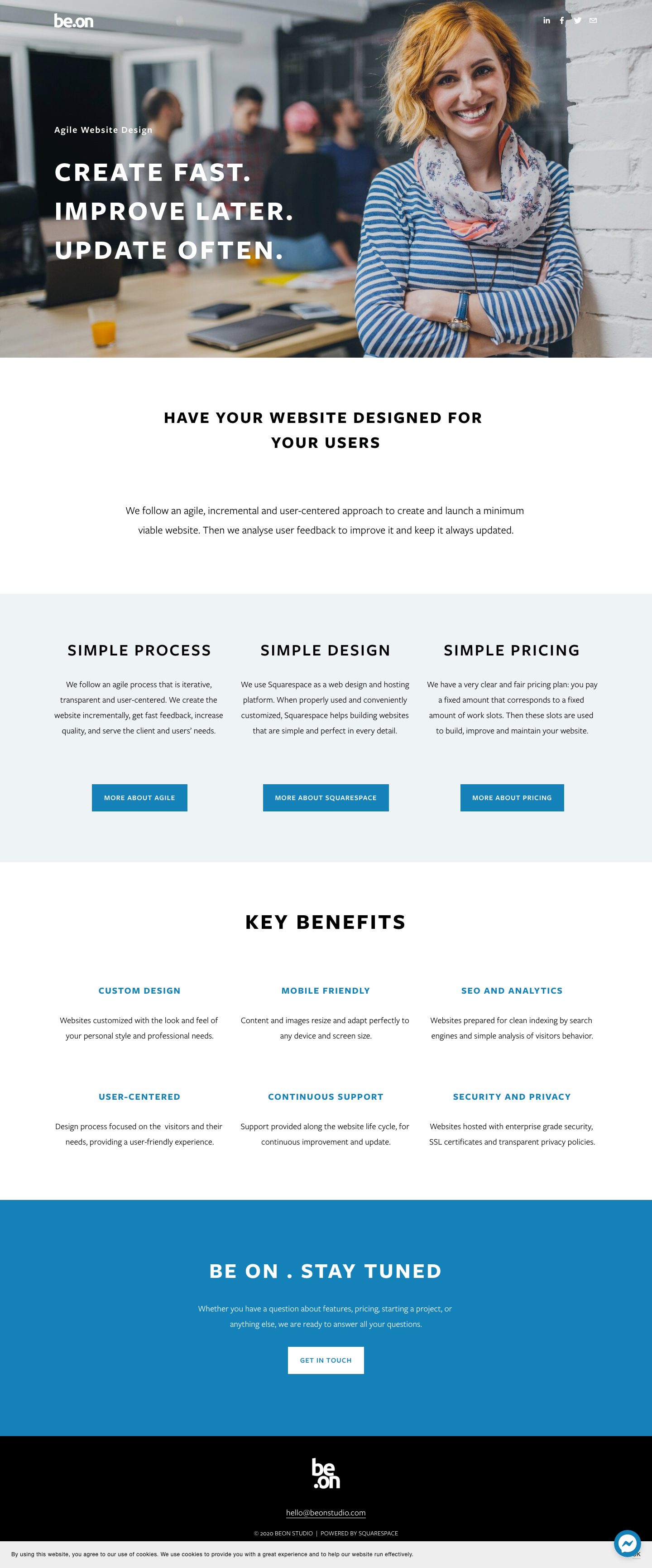 It includes content strategy definition, responsive design, contact form setup, blog setup, SEO, Analytics report, and one month of support.
